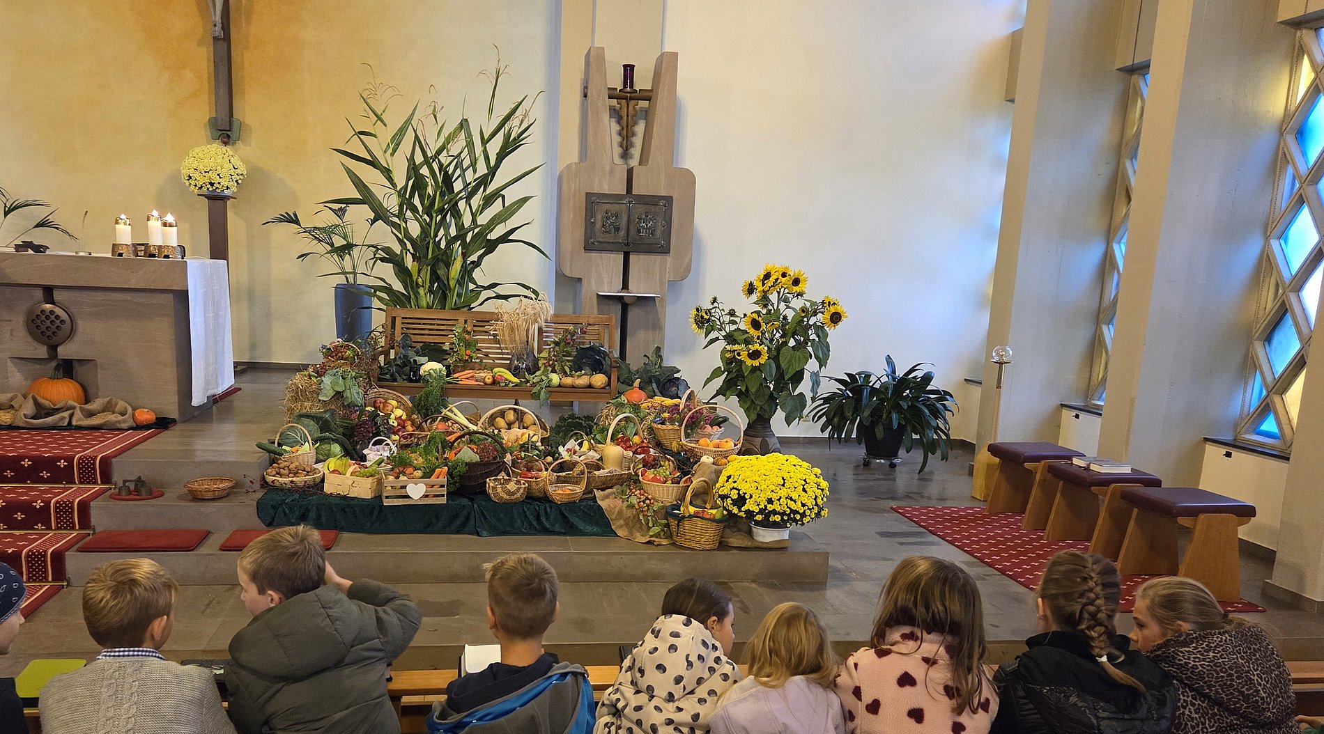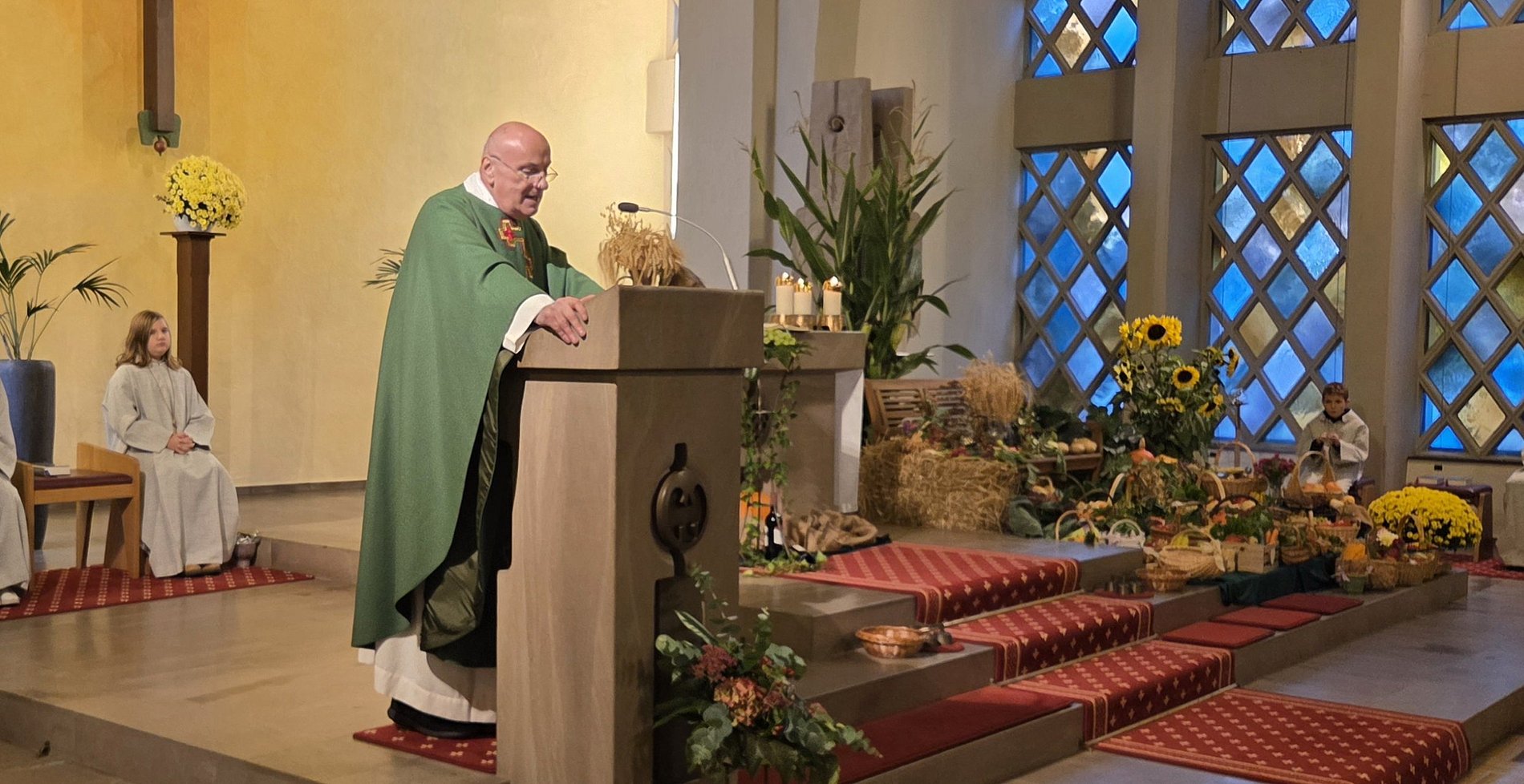 Im Vorabendgottesdienst kamen in der St. Margaretha Kirche viele Gläubige zusammen, um gemeinsam Erntedank zu feiern. Der Altarraum war reich geschmückt mit Früchten, Getreide, Wein, Brot und Herbstblumen, die von Pallottiner Pater Norbert Possmann während der Messe gesegnet wurden. Über die Teilnahme der vielen Kinder am Gottesdienst freute sich der Priester ganz besonders.