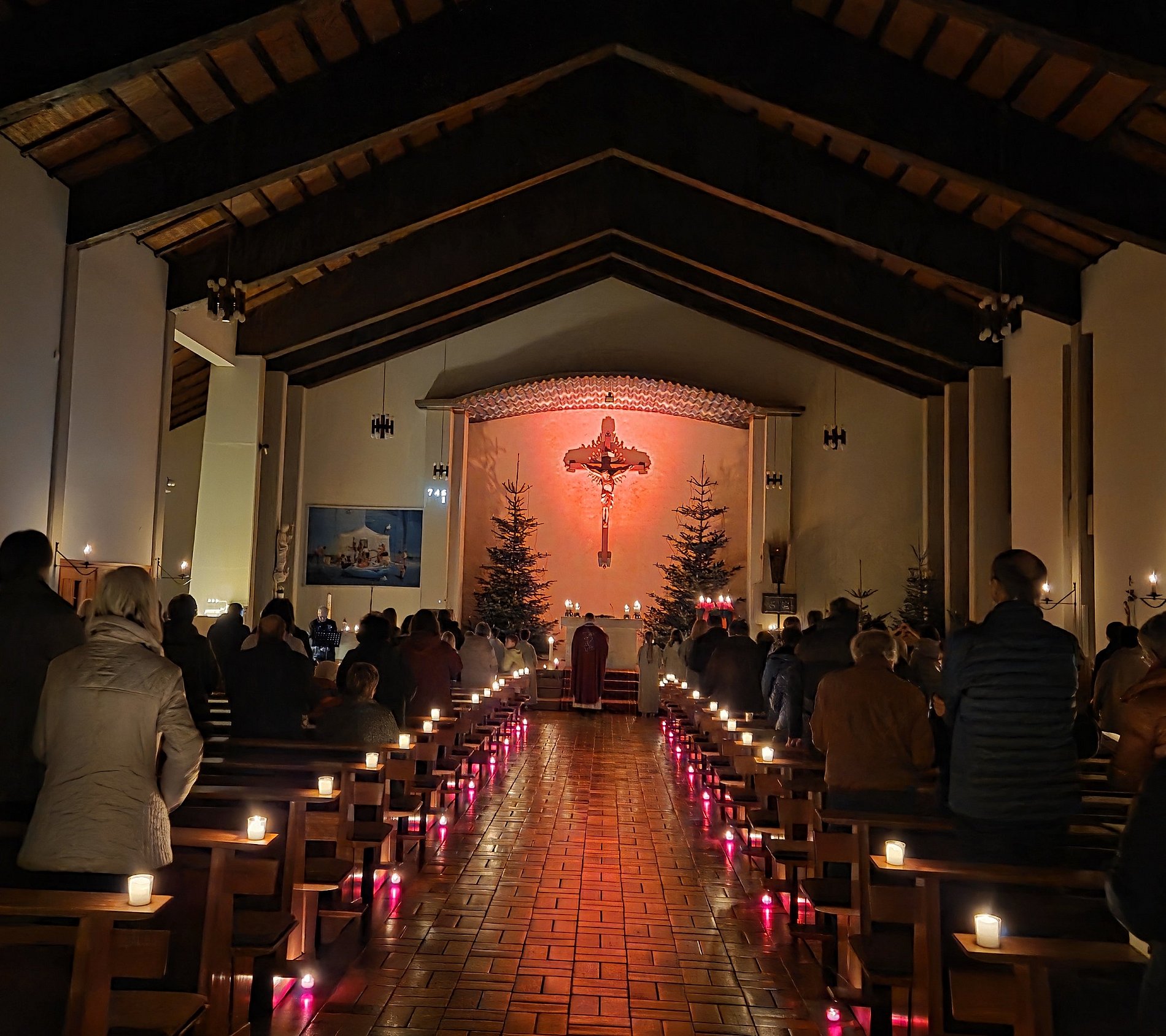 Die zahlreichen Kerzenlichter ließen das Gotteshaus in einem warmen Licht erstrahlen und zauberten eine besondere Atmosphäre. Christoph Engers begeisterte gleich zu Beginn an der Orgel mit „Cantabile Nr. 2“ von Pasini. Auch der meditative Text von Jürgen Becker und der schöne Sologesang von Dorothea Noll Feger trugen zu einem feierlichen Gottesdienst bei, der von Pater Sono und Diakon Bruns zelebriert wurde.