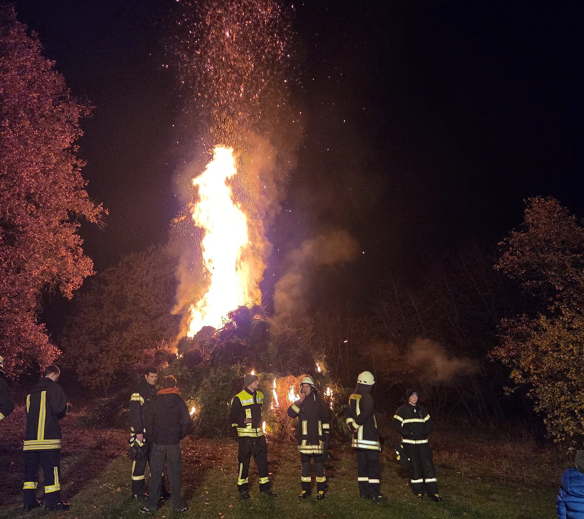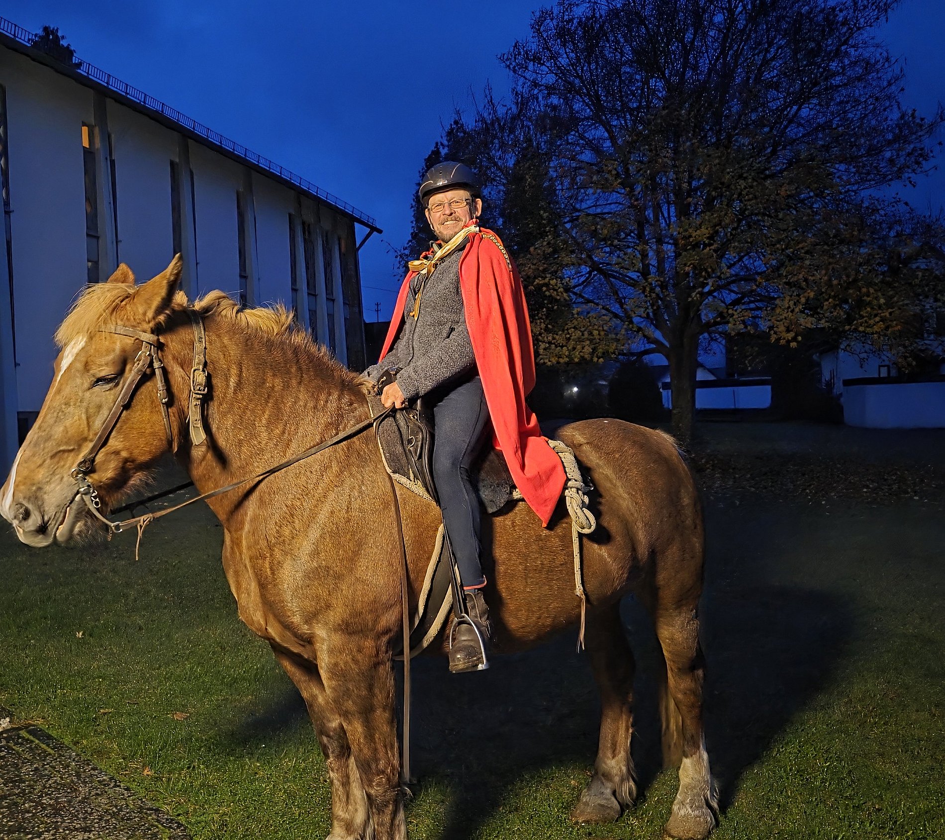 Natürlich durfte das Pferd mit St. Martin nicht fehlen. An der Grillhütte erwartete die Gemeinde ein riesiges Martinsfeuer, das die Feuerwehr aufgebaut hatte und bewachte.