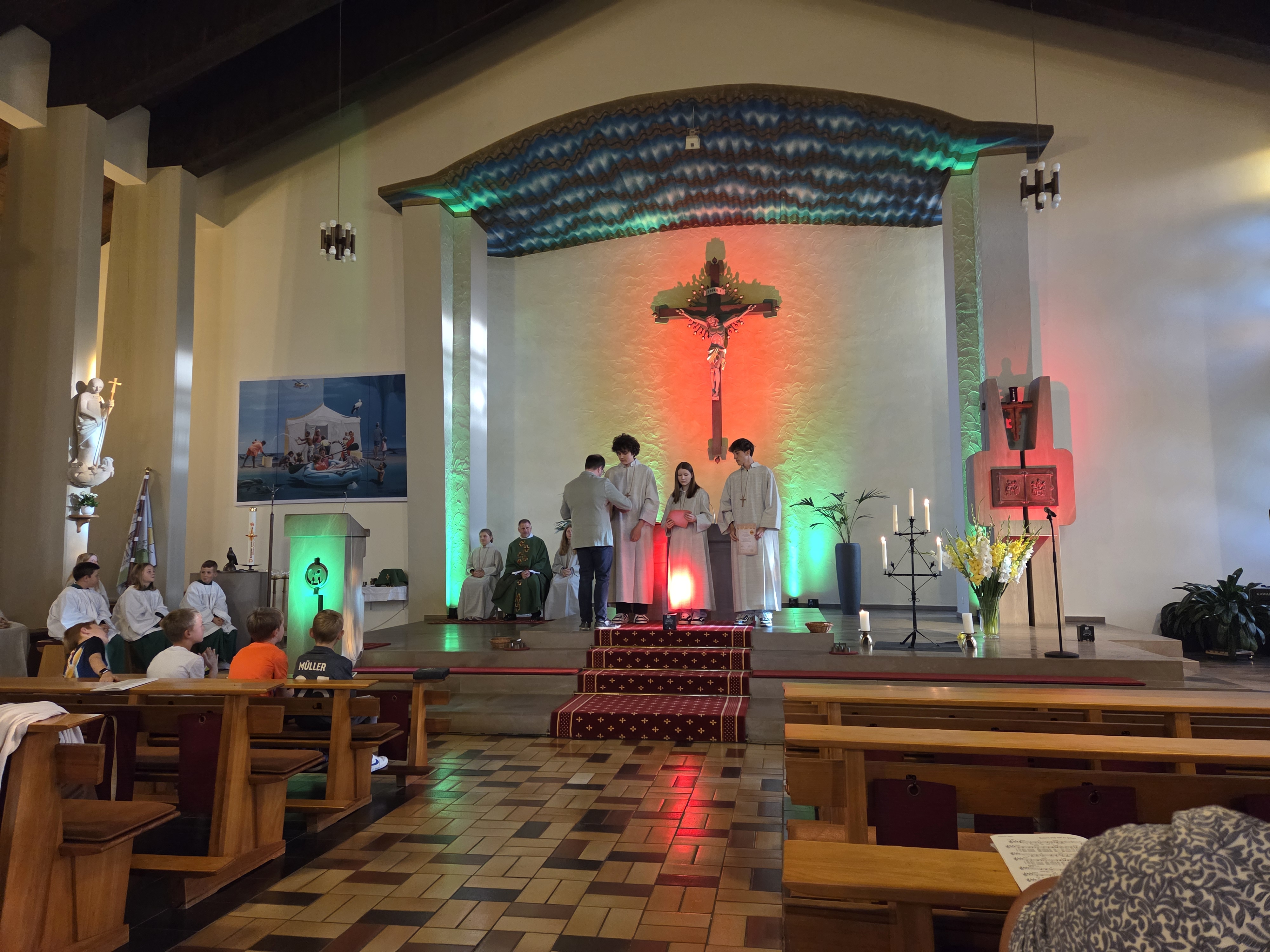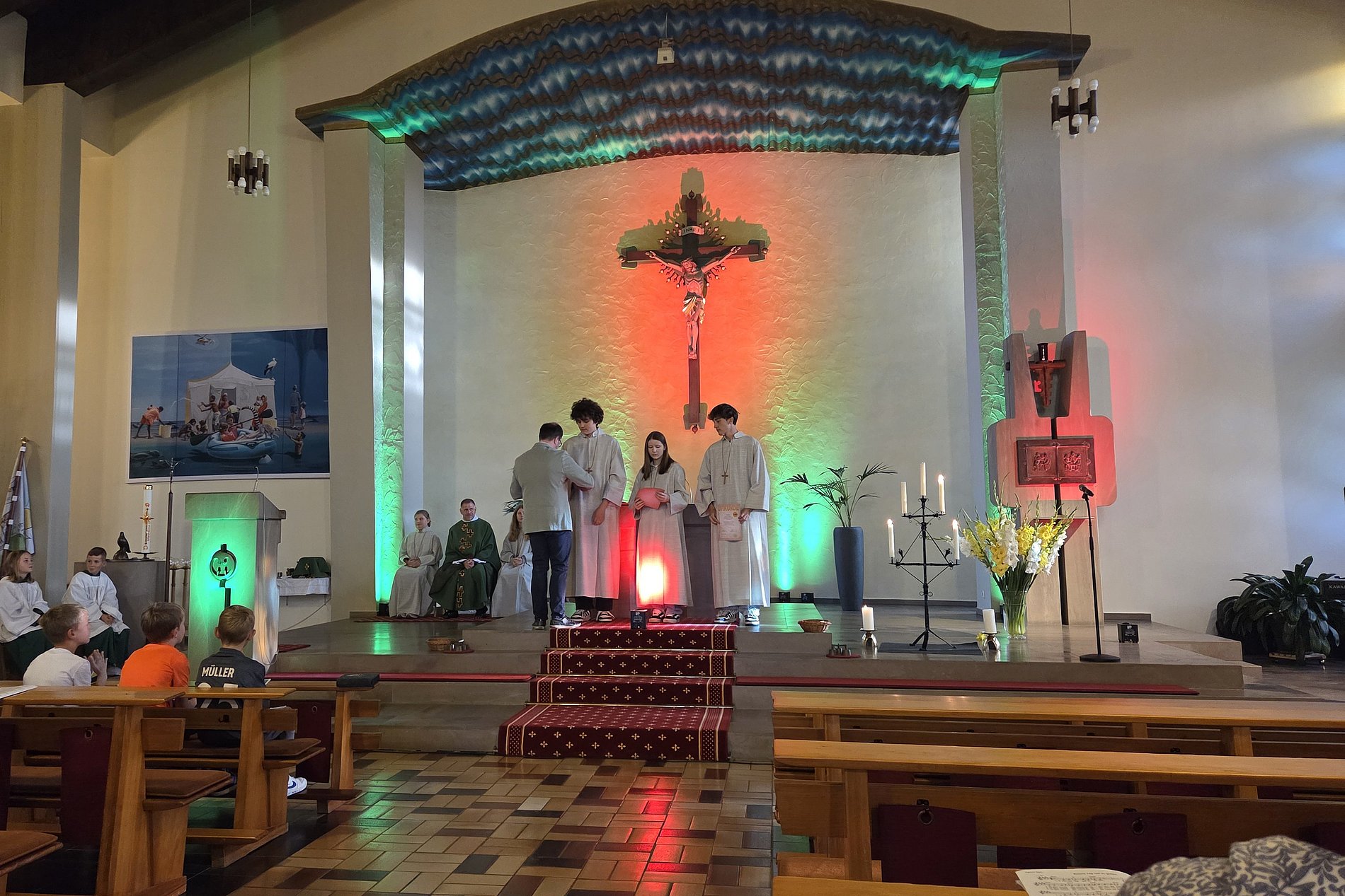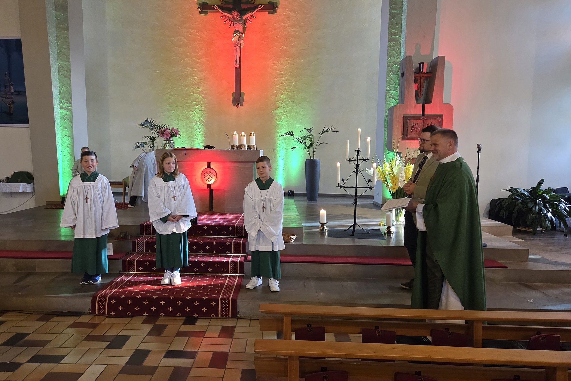 Das Kirche jung und fröhlich und zugleich sehr feierlich sein kann, erlebten die gut 100 Gottesdienstbesucher in der Kirche St. Margaretha Herschbach bei der Einführung der drei neuen Ministranten. Messdienerleiter Jake Kaiser hatte zuvor Mara, David und Simon auf ihren Dienst am Altar vorbereitet.