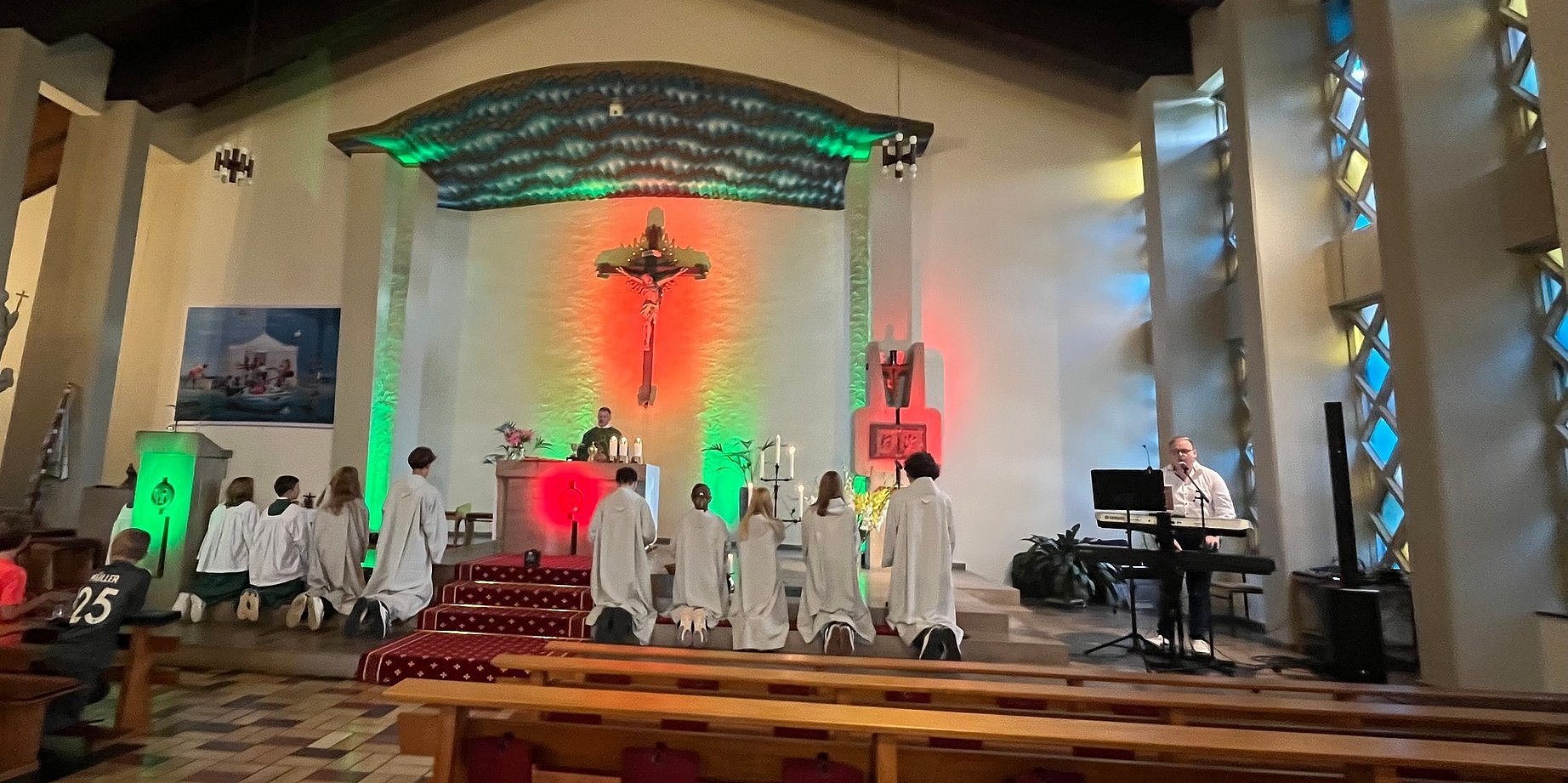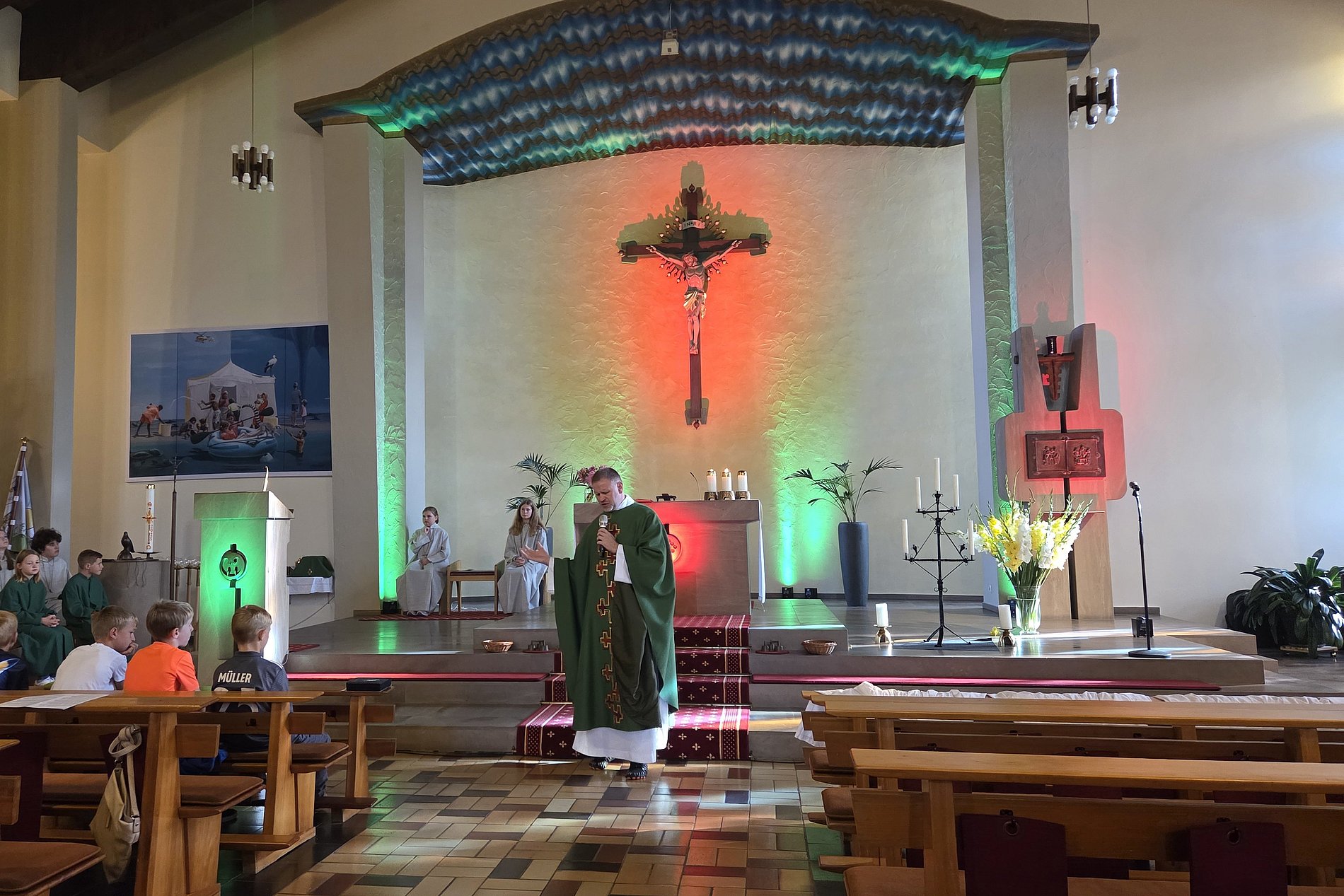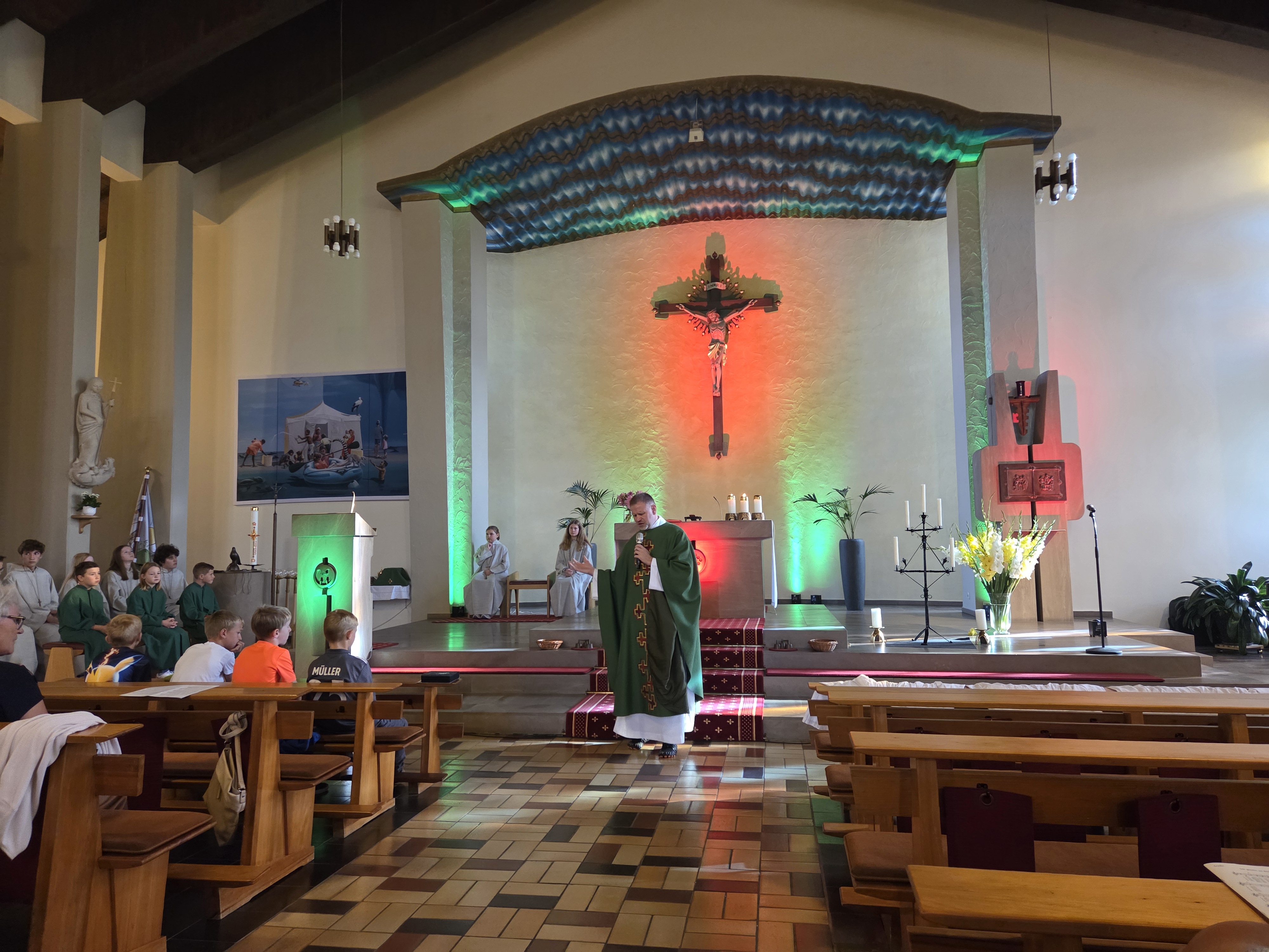 Kaplan Matthias Thiel, die Messdiener und die drei „Minis“ zogen feierlich ins Gotteshaus ein. Die Gemeinde merkte schon beim Eingangslied, dass es ein anders Gottesdienstformat ist als gewohnt. Kaplan Thiel hat mit Lars Hastrich am Keyboard unter dem Thema „Im Rhythmus des Himmels“ moderne Lieder eingeübt, die vorher schon an verschiedenen Kirchorten im Gottesdienst zu hören waren. Der Altarraum war in bunten Farben angestrahlt und schaffte eine positive und ansprechende Atmosphäre.